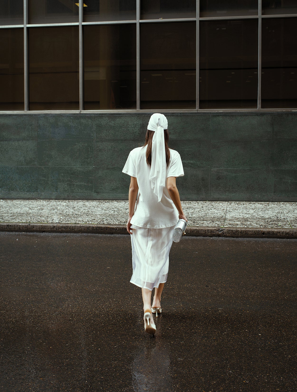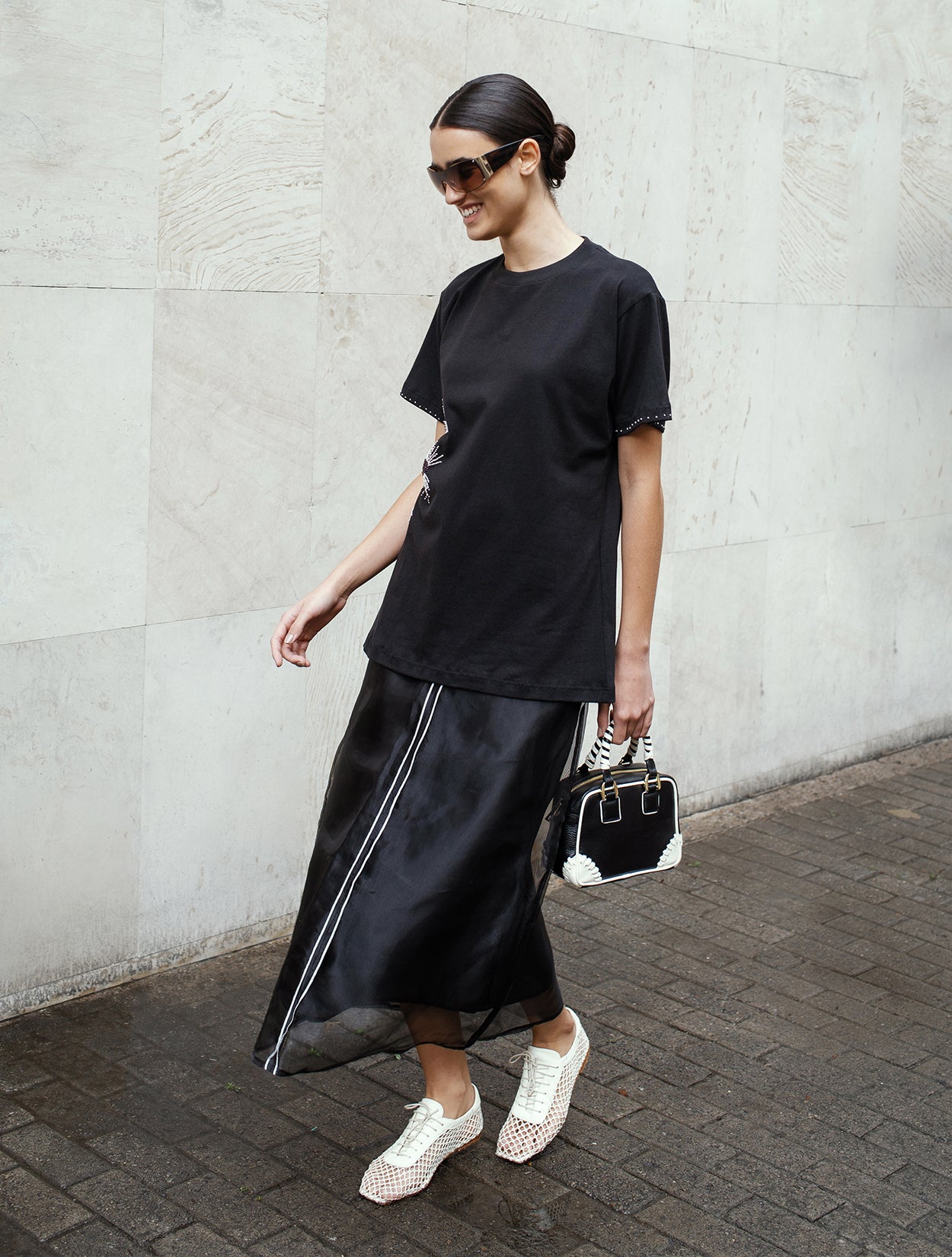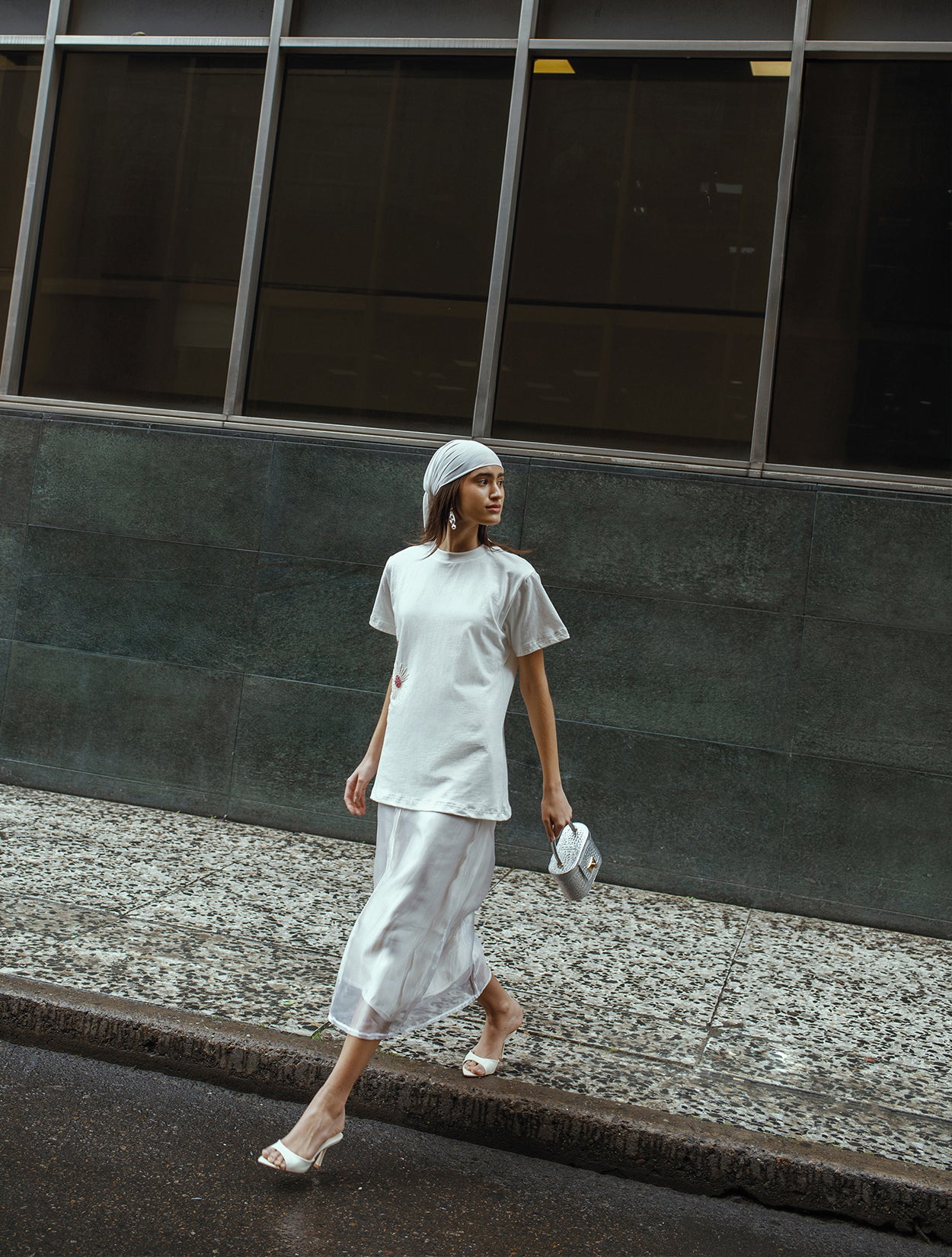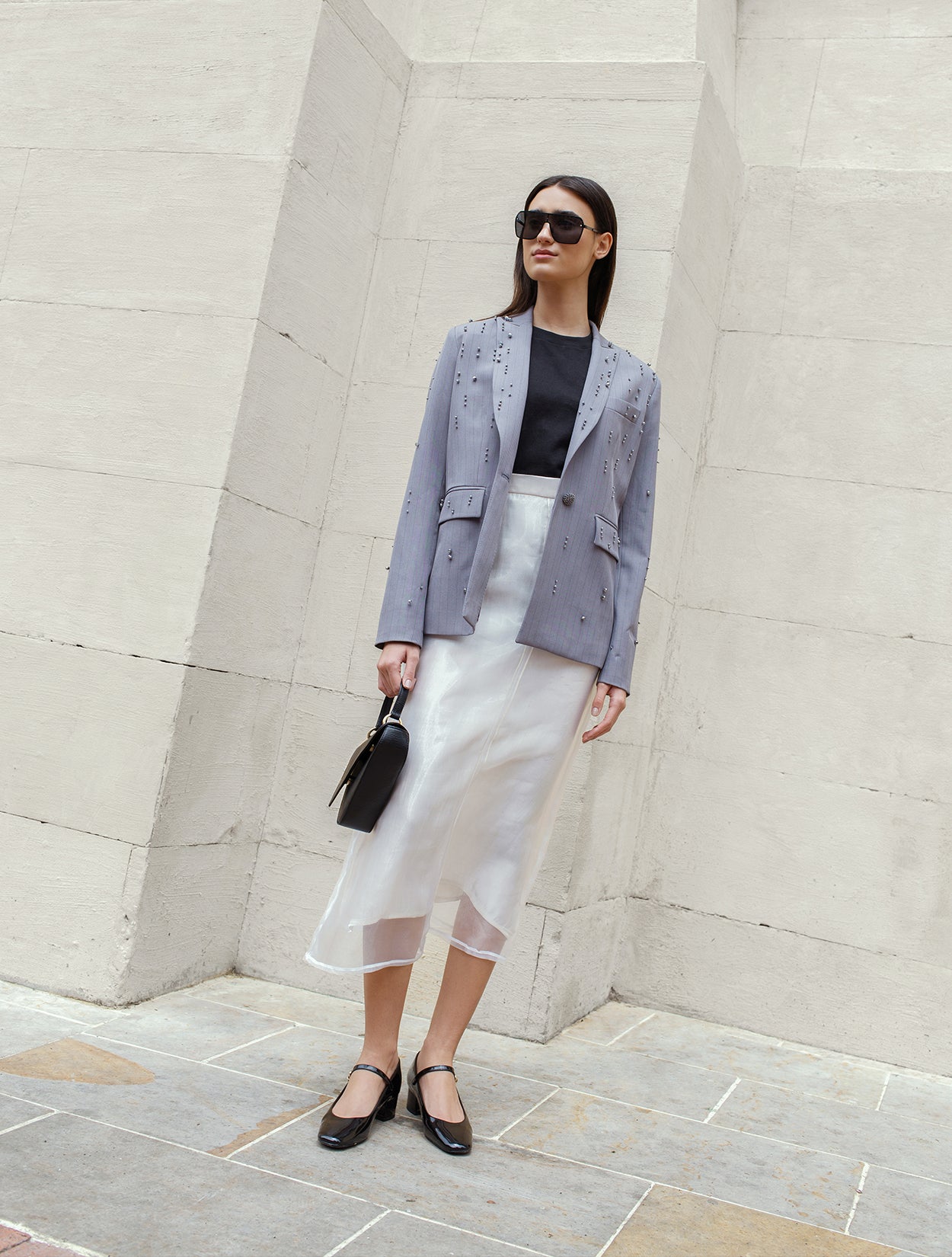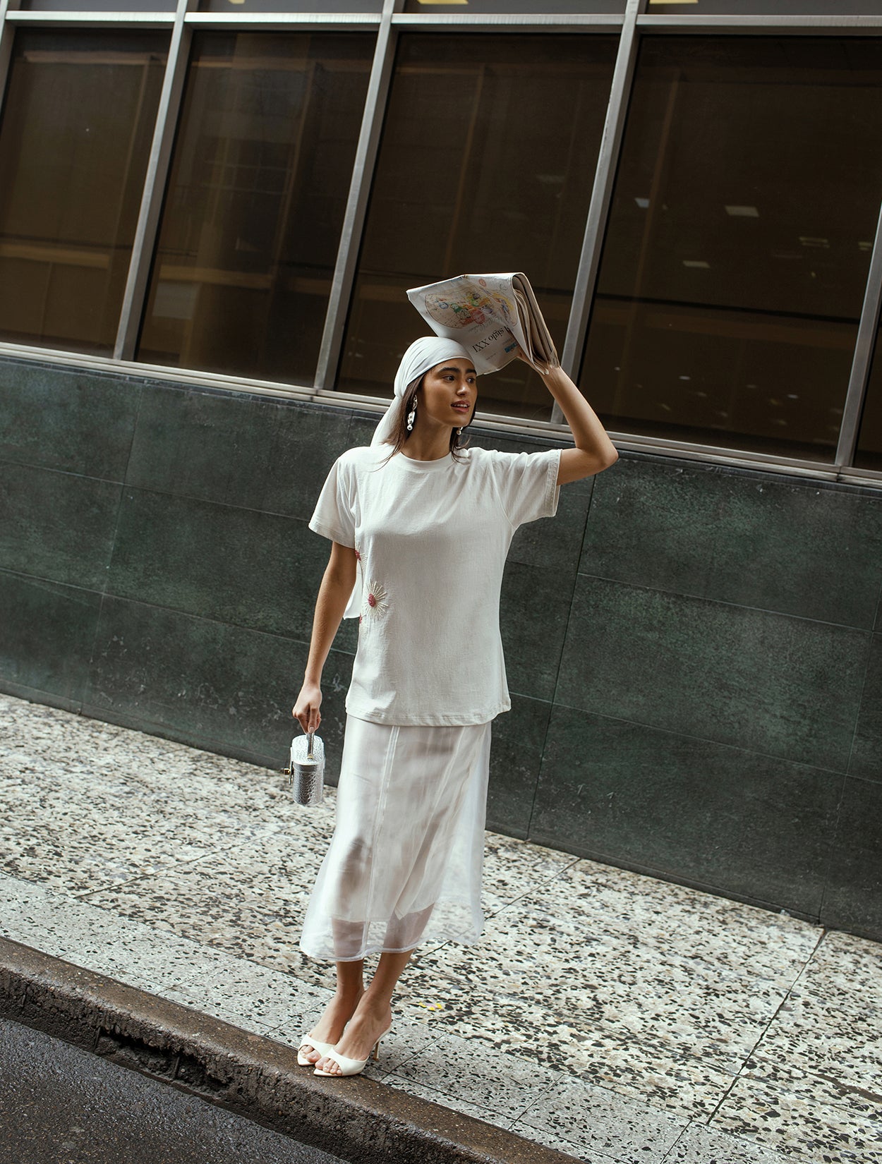 Falda de organza con dos capas ligeramente traslucidas ,movimiento fluido y un efecto liviano al caminar. Su diseño recto y elegante se complementa con una franja vertical en contraste.